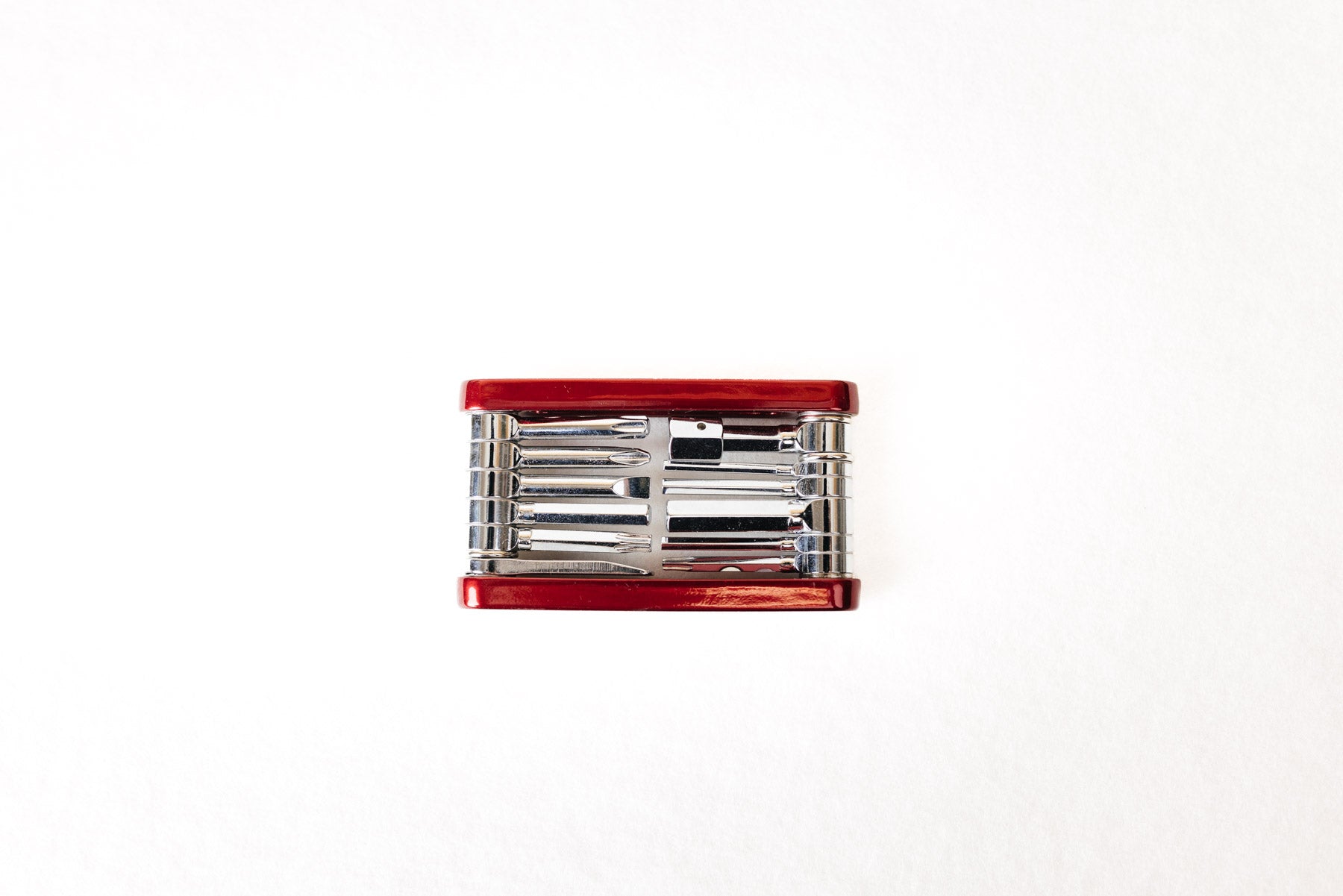 The mid-length tool design is long enough to provide access to recessed fasteners, but short enough not to experience twist or damage under moderate torque as can happen on longer tools. All tools are forged rather than bent from hex stock. While this method of construction is more expensive, the value is unquestioned during a road-side repair. Mid-length tools also allow us to position the tools within the same plane, reducing the thickness of the overall package by half. Double chromed tools and fully stainless steel hardware and bushings guarantee a long life without corrosion (the number 1 killer of multi-tools is corrosion). Forged aluminum sidebars contain rare-earth magnets for holding a spare chain connector.